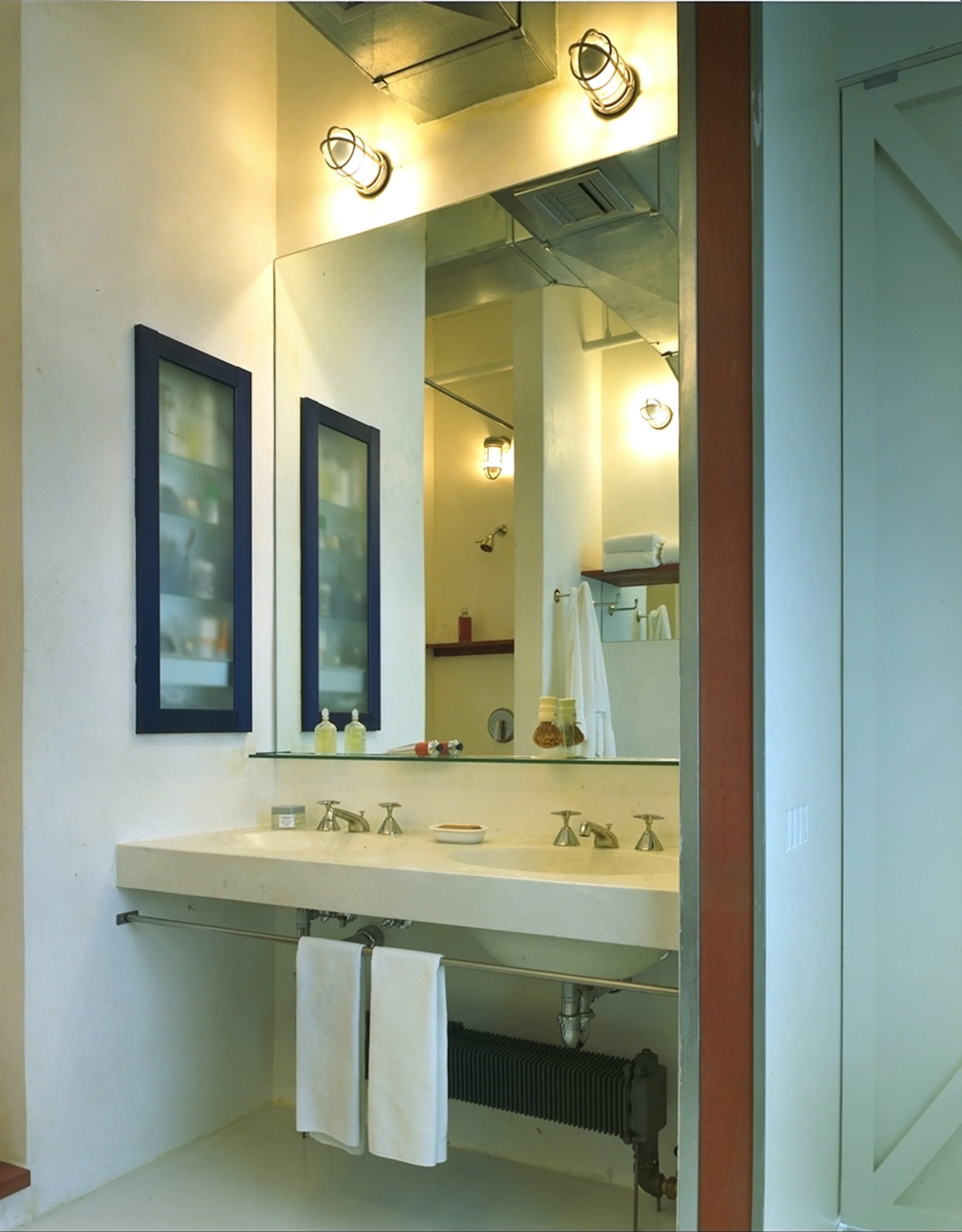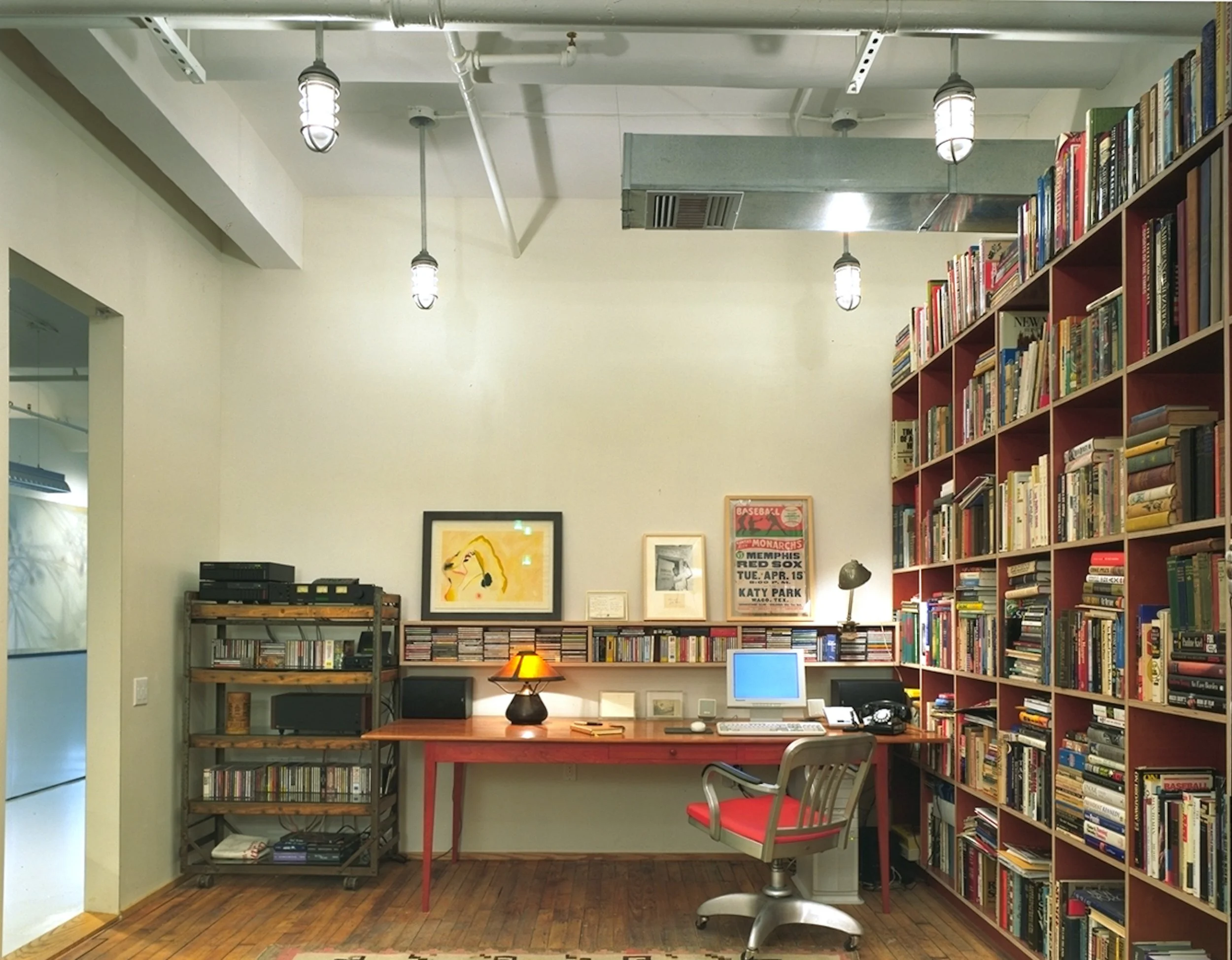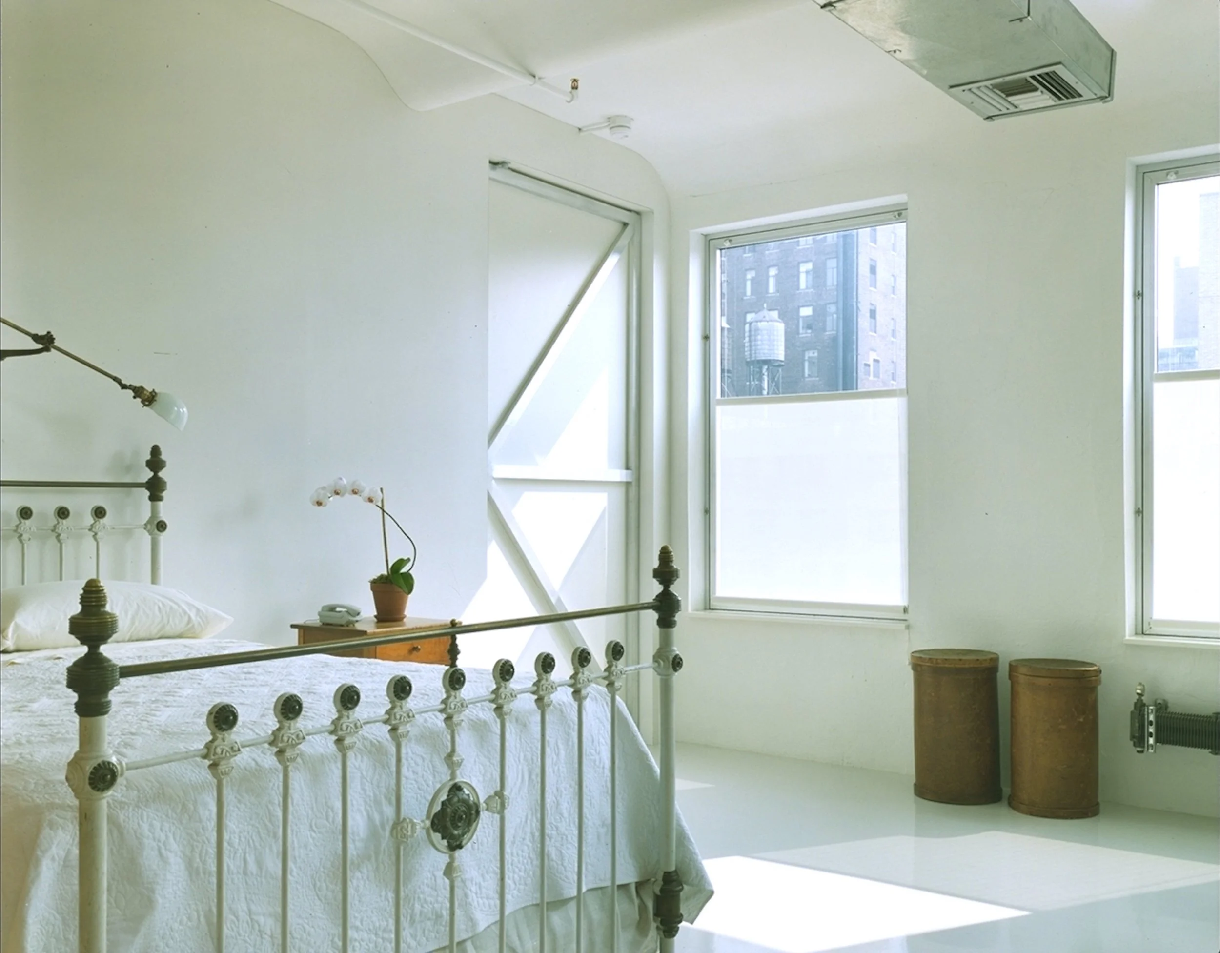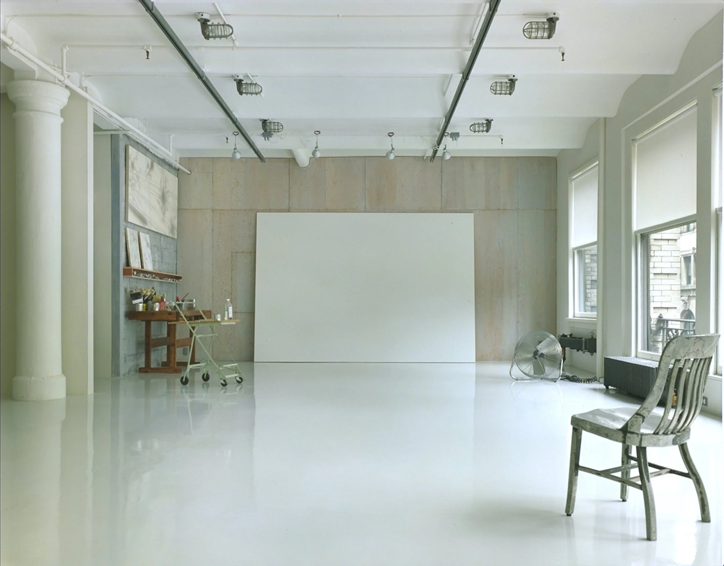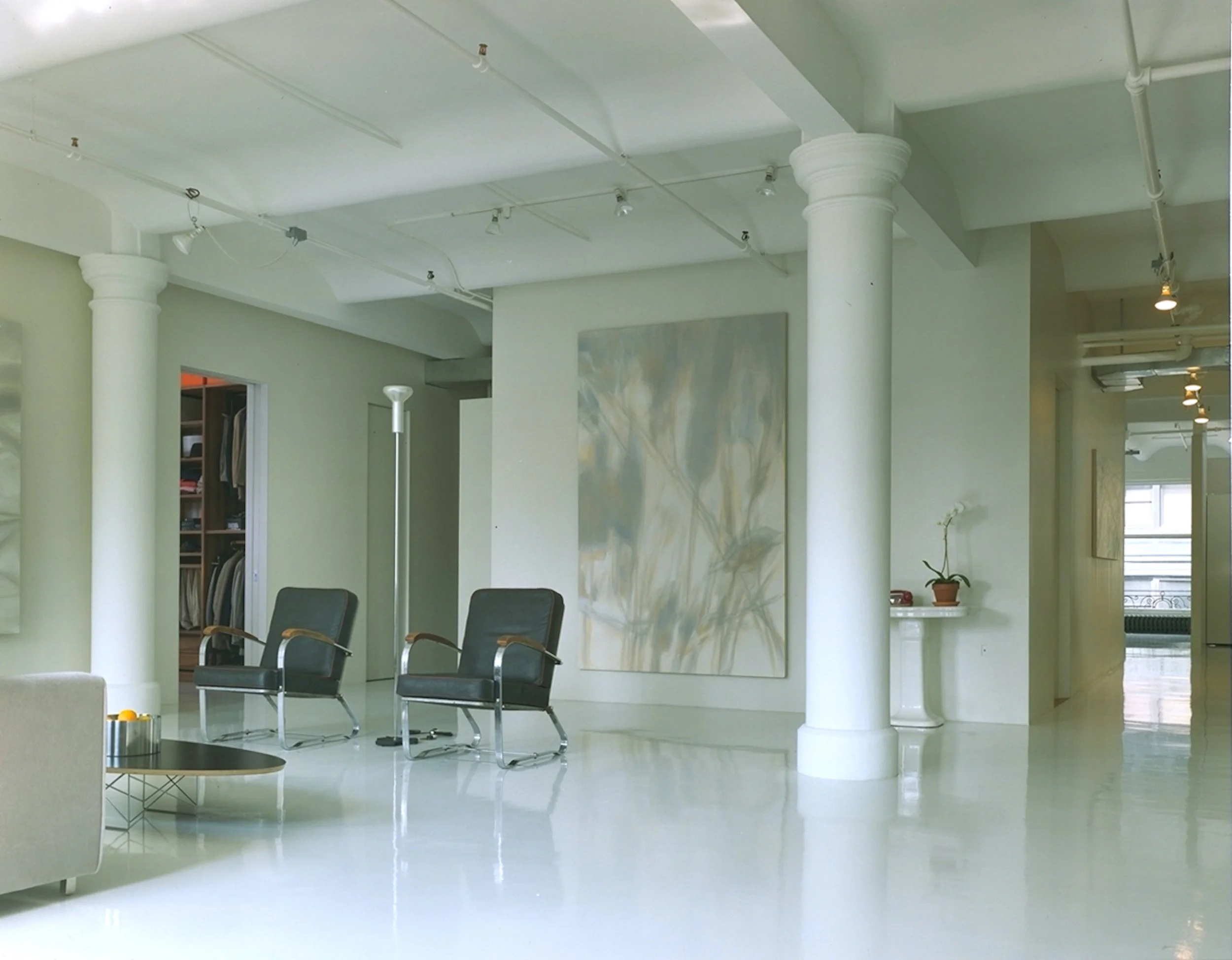 In this unified living loft and art studio, the early 20th century character of the shell was restored. Within the space, an entirely new kit-of-parts featured an attitude towards detail both primitive and precise. The floor was covered with a completely uniform epoxy/urethane finish. The partitions are covered in joint compound, establishing a 3D abstract gray field as a background for the artwork.
